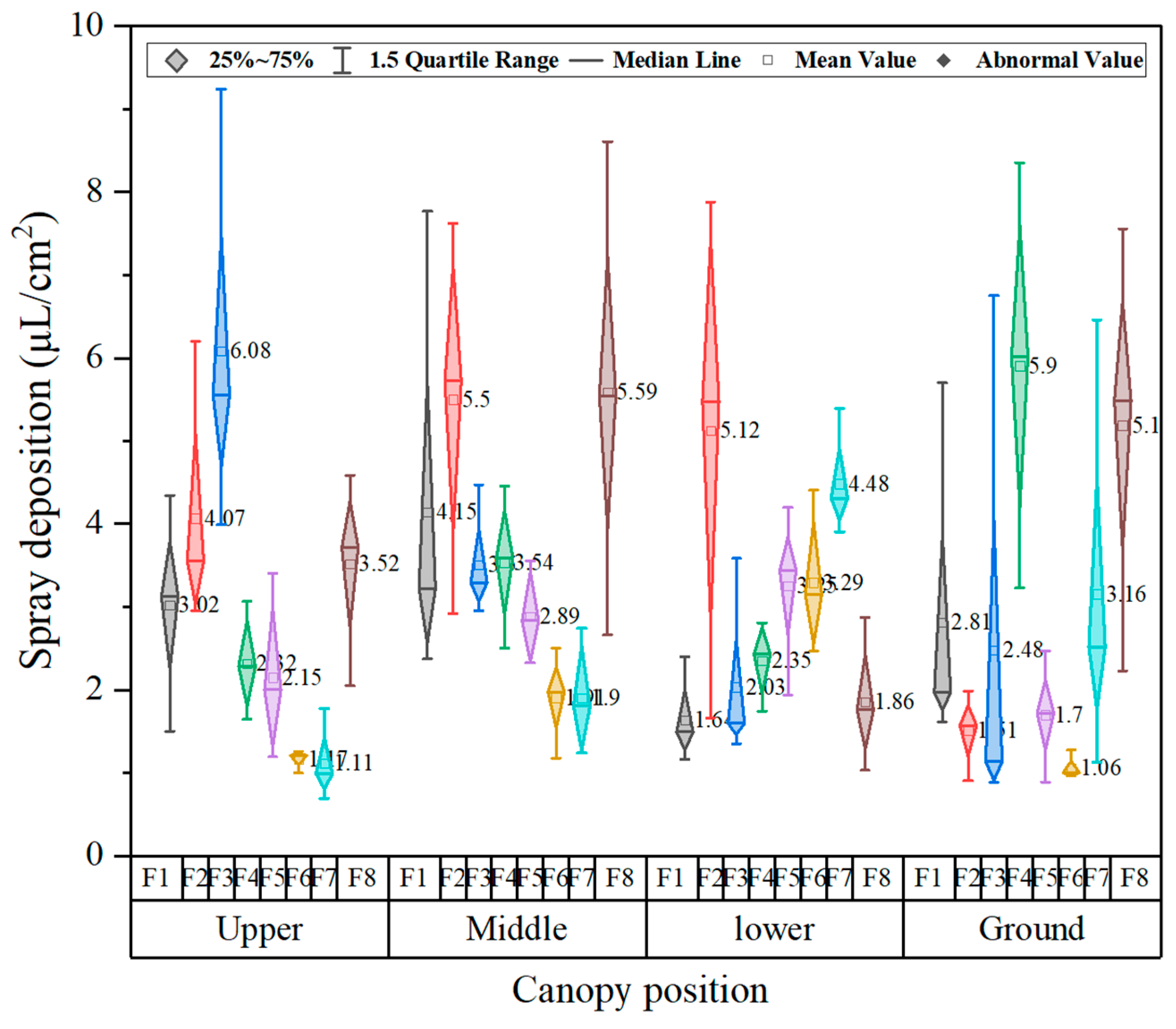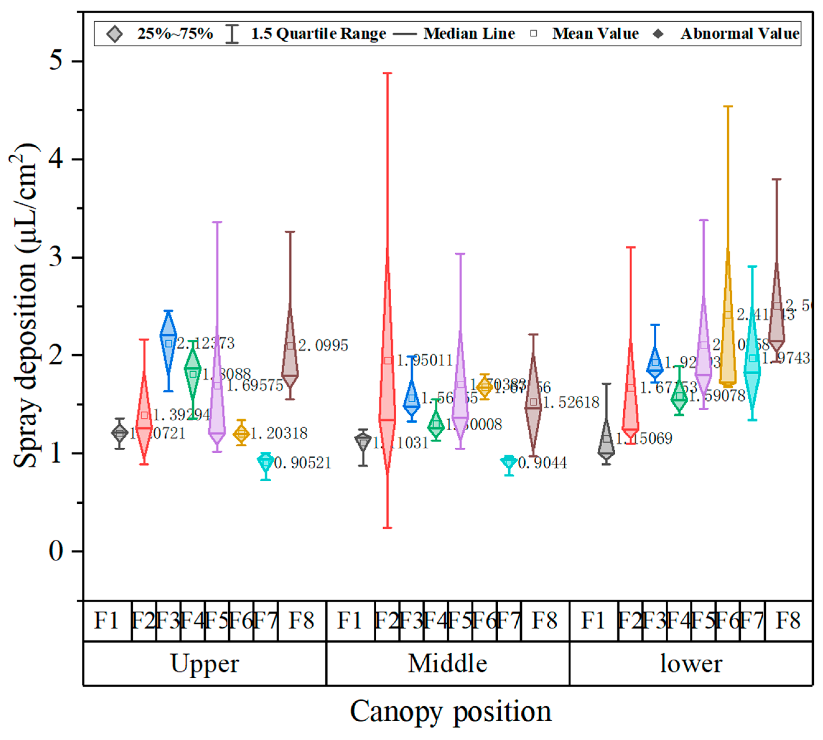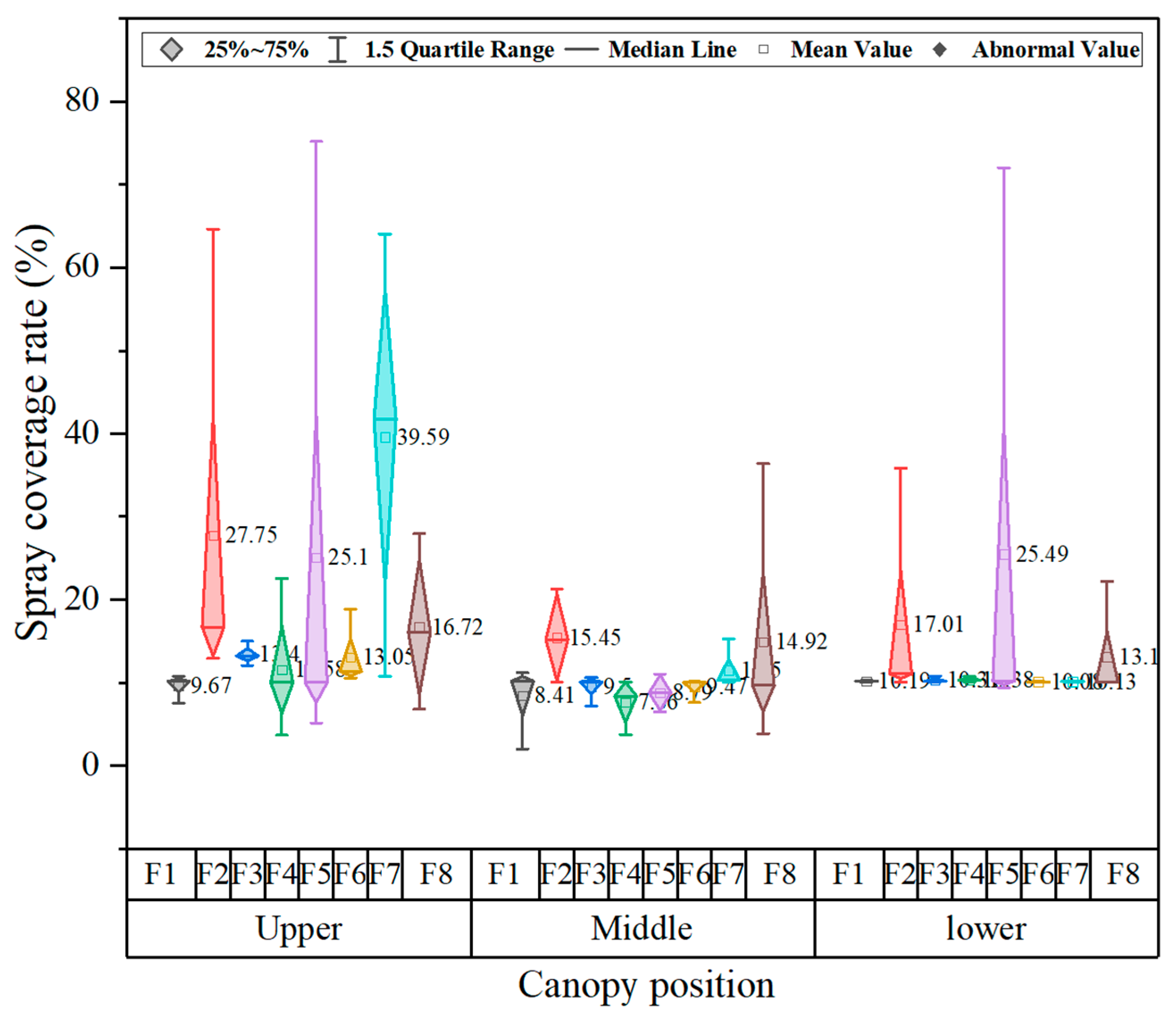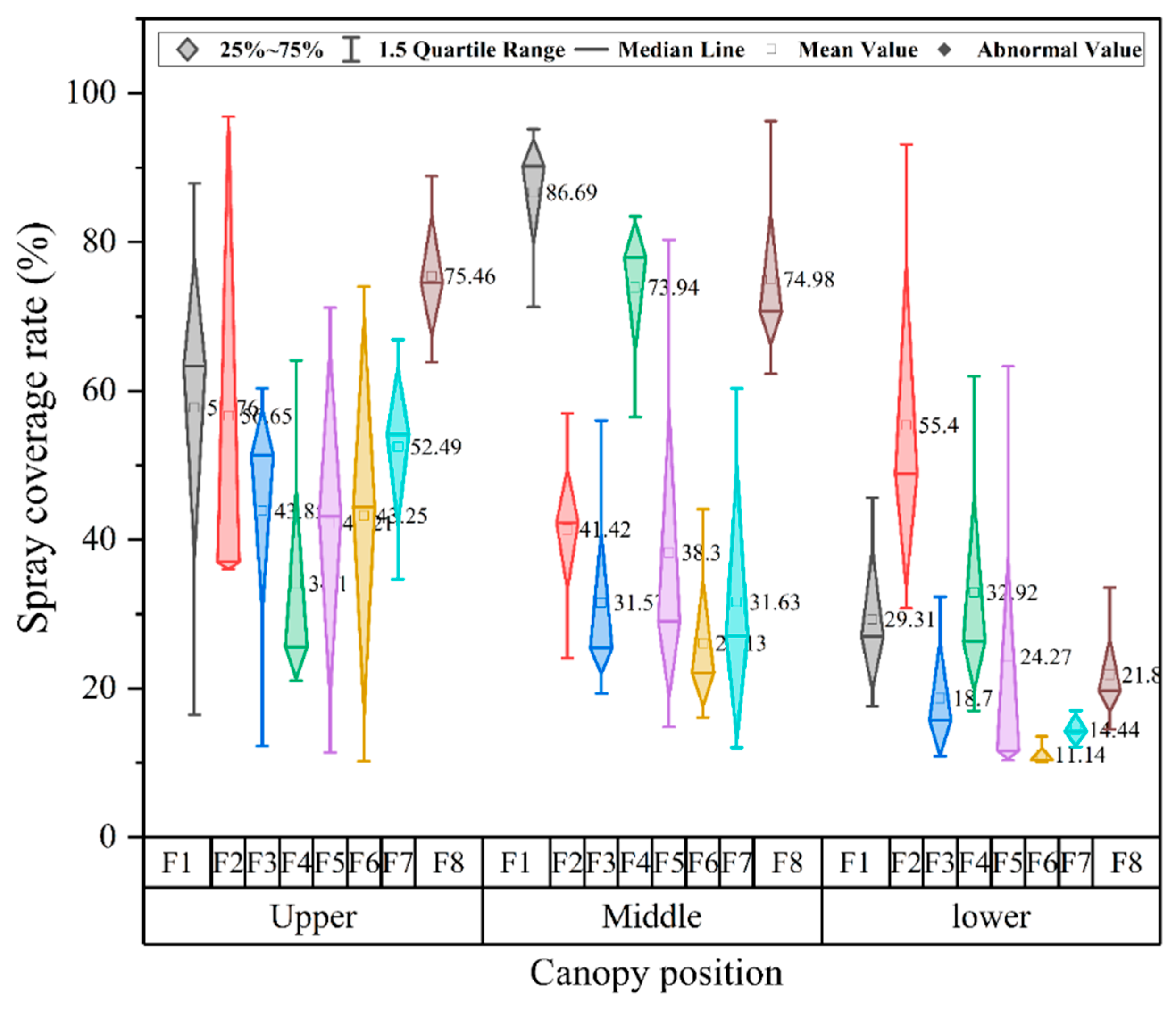 - The field tests showed that the deposition of fog droplets on the front of tomato leaves followed the order middle > lower > ground > upper (3.622 μL/cm2, 3.005 μL/cm2, 2.977 μL/cm2, and 2.931 μL/cm2, respectively). Comparing the effects of eight field trials, it could be seen that the F2, F3, and F8 groups had the highest sedimentation amounts in the three parts of the canopy, with total amounts of 14.688 μL/cm2, 11.624 μL/cm2, and 10.962 μL/cm2, respectively, which were significantly higher than those of F6 and F7 groups (6.375 μL/cm2 and 7.500 μL/cm2). The results indicate that adding additives or increasing the swing-arm angle is beneficial for improving the uniformity of canopy droplet deposition. Compared with the spray angle, the swing-arm speed, and nozzle model, the average coverage rate of each tomato canopy fluctuated greatly, so the spray uniformity effect was general. From Figure 14 and Figure 15, it can be seen that the front fog droplet coverage of the lower canopy of tomatoes was the lowest, with an average of 26.00%, while the middle and upper canopies were the highest, with an average of 50.58% and 50.72%, respectively. The overall uniformity of the back coverage was good, which can effectively solve the problem of adhesion on the back of tomato leaves. The research found that the spray coverage rate on the front and back sides of tomato leaves was relatively uniform, indicating that the swing-arm greenhouse spray designed in this paper can meet the spray quality requirements for tomato pest control.