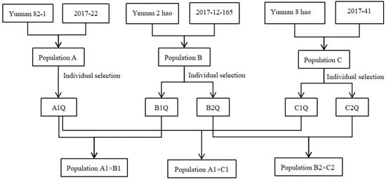 A base population was established using six wild S. spontaneum accessions with high biomass yield from diverse habitats. Hybridizations generated three populations: Yunnan 82-1 × 2017-22 (Population A), Yenan 2 hao × 2017-12-165 (Population B), and Yunnan 8 hao × 2017-41 (Population C). Superior individuals (A1, B1, B2, C1, C2) were selected from the F1 generation to establish the first-cycle selection population. Subsequent crosses produced advanced populations A1 × B1, A1 × C1, and B2 × C2 (Figure 1). Thirty individuals from F1/F2 S. spontaneum polymer were randomly sampled per population (29 from Population C), supplemented with 6 F1 parents, 5 F2 parents, and 9 wild S. spontaneum accessions, totaling 199 materials. All accessions were container-grown at Yunnan Academy of Agricultural Sciences Sugarcane Research Institute (February–November 2022). Fresh leaves collected at the tillering stage were stored at −25 °C. Material characteristics are shown in Table 1.