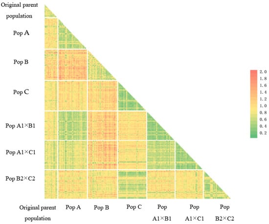 The effective number of alleles (Ne), Nei’s gene diversity (H), and Shannon’s information index (I) were employed to assess genetic diversity levels, reflecting allele abundance and evenness within populations [35]. As presented in Table 5, across the seven S. Spontaneum populations, the number of polymorphic loci (NPB) ranged from 186 to 226, with the percentage of polymorphic alleles (PPB) spanning 73.52% to 89.33%. The mean effective allele number per SSR locus was 1.3573. Nei’s genetic diversity index (H) varied between 0.1931 and 0.3041, while Shannon’s information index (I) ranged from 0.3061 to 0.4578. Among which, the Nei’s diversity index and Shannon information index of the parental population and the B2 × C2 population were significantly higher than those of the other populations.