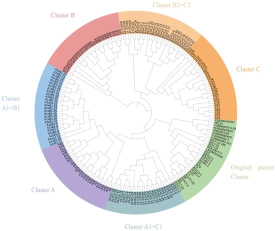 UPGMA clustering analysis (Figure 3) showed that all accessions segregated into seven clusters, consistent with their original population affiliations: Original Parent Cluster, Cluster A, Cluster B, Cluster C, Cluster A1 × B1, Cluster A1 × C1, and Cluster B2 × C2. Clusters A, B, A1 × B1, and A1 × C1 exclusively comprised accessions from their corresponding populations. Accession B39 clustered with the B2 × C2 population in Cluster B2 × C2, while B3 and accessions from Population C grouped within Cluster C. A1Q, A2Q, A1, A10, B4, B6, C1, C3, A1 × B1-2, A1 × B1-3, A1 × B1-4, A1 × C1-1, A1 × C1-30, B2 × C2-1, B2 × C2-2, B2 × C2-3 and accessions from original parent population coalesced into the Original parent cluster.