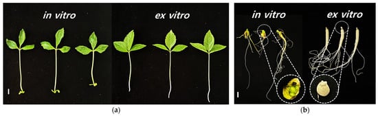 For ex vitro cultivation, 1000 intact ginseng seeds were sown in plastic boxes (0.5 × 0.3 × 0.3 m) filled with artificial soil (Golden Root Ginseng Soil, Nongkyung Co, Jincheon, Korea) composed of peat moss and perlite at a 3:1 (v/v) ratio. The average soil pH was 6.17, as determined by soil analysis. The planting density for ex vitro conditions was adjusted to match the same unit area. Irrigation was performed once per week by applying 2 L of water per box to maintain field capacity, and the boxes were placed in a greenhouse. Germination rate was 92.38%. No additional nutrient supplementation was applied to the soil. Plants were cultivated for five months.
