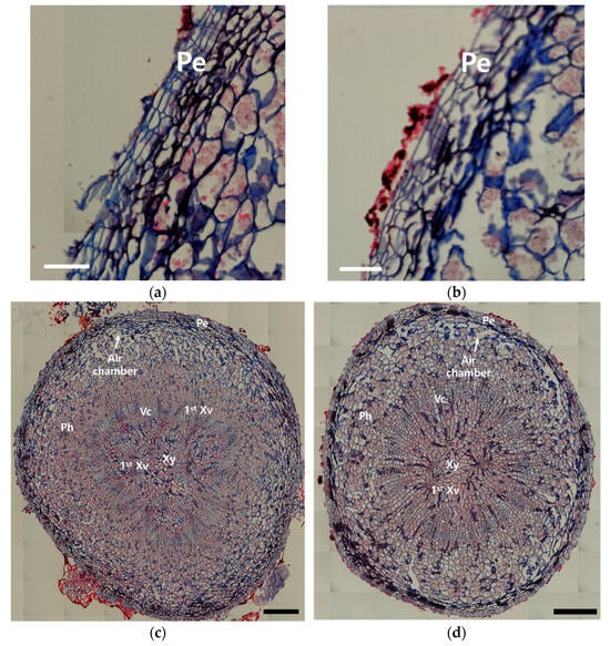 Histological characteristics of ginseng roots grown under in vitro and ex vitro conditions. (a) Periderm structure of in vitro roots; (b) periderm structure of ex vitro roots; (c) transverse section of in vitro roots; (d) transverse section of ex vitro roots. Scale bars: (a,b) = 100 μm; (c,d) = 500 μm. Pe, periderm; Ph, phloem; Vc, vascular cambium; Xy, xylem, 1st Xv, primary xylem vessel.