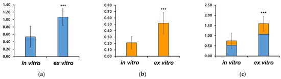 Comparison of chlorophyll content in ginseng leaves grown under in vitro and ex vitro conditions. (a) chlorophyll a, (b) chlorophyll b, and (c) total chlorophyll contents (mg/g) (***, p < 0.001). Data are presented as mean ± standard deviation (n = 10). Statistical significance was determined using a two-sample t-test or Welch’s t-test. *** p < 0.001.