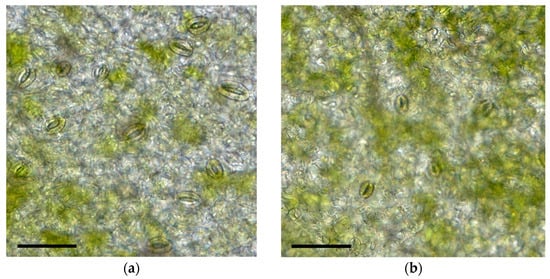 Stomatal morphology on the abaxial surface of ginseng leaves grown under (a) in vitro and (b) ex vitro conditions. Scale bar = 100 μm.