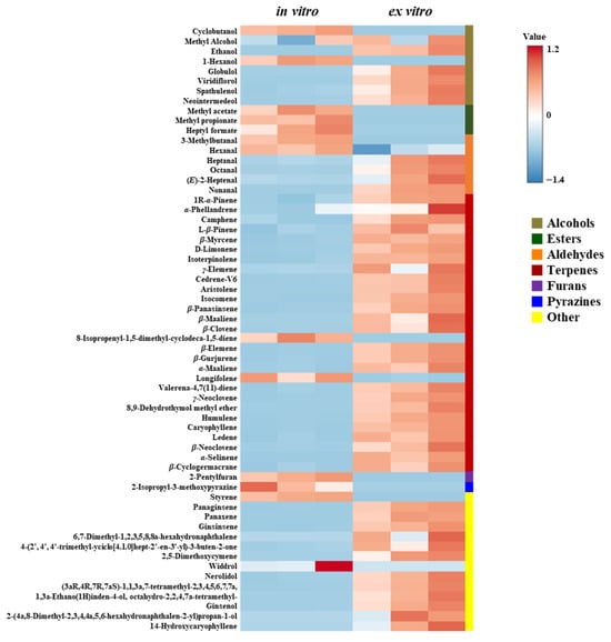 Heatmap visualization of volatile compound distribution in the underground parts of ginseng grown under in vitro and ex vitro conditions. Each row represents a compound, and columns represent biological replicates from each treatment group. Color intensity indicates relative abundance after normalization.