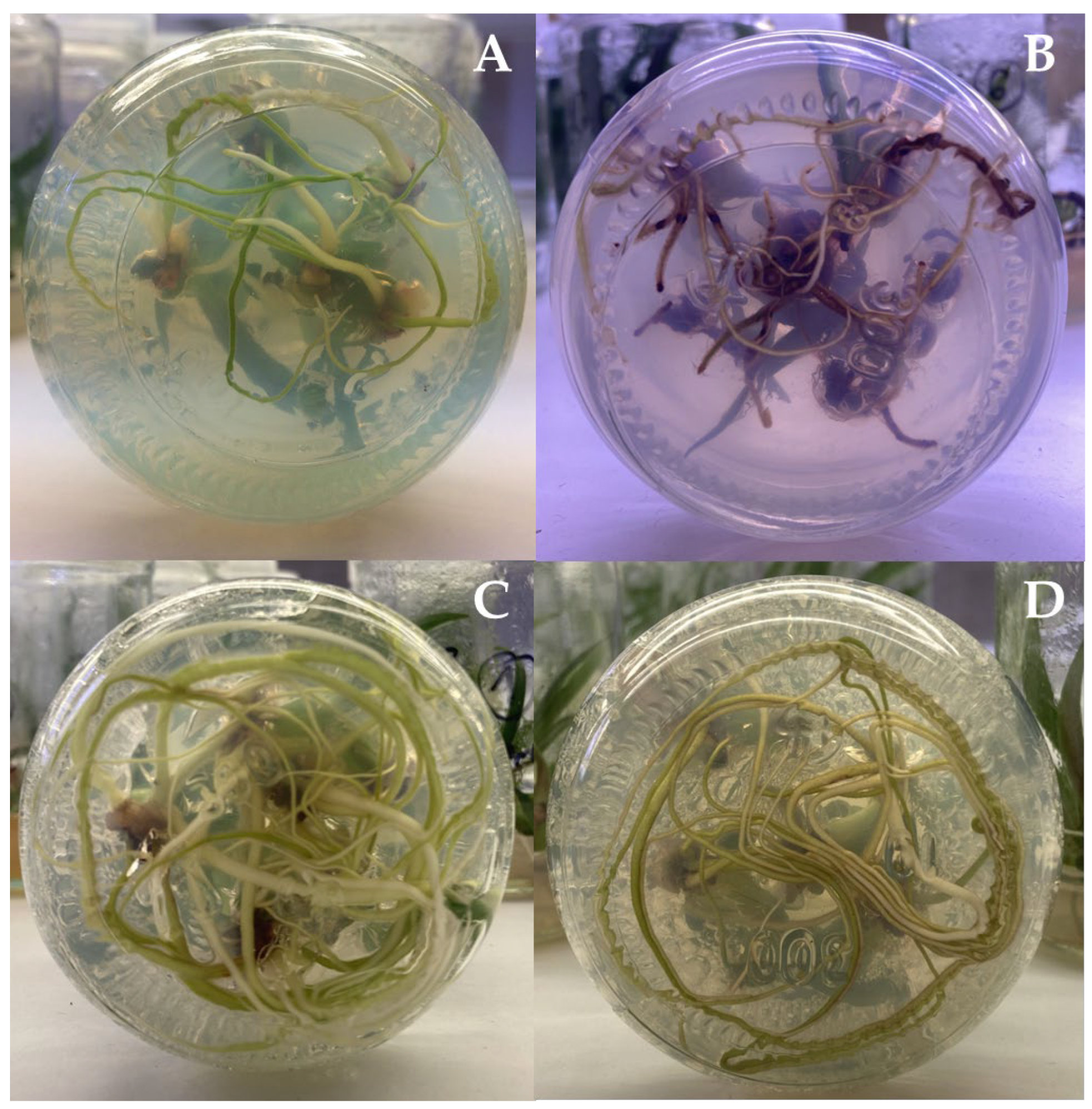 45], preparations containing exogenous hormones from seaweed, such as auxins or cytokinins, may have a beneficial effect on rhizogenesis processes in in vitro cultures. This effect is attributed to the natural auxins, cytokinins and gibberellins, which stimulate cell division, cell elongation and the development of plant organs, including roots [