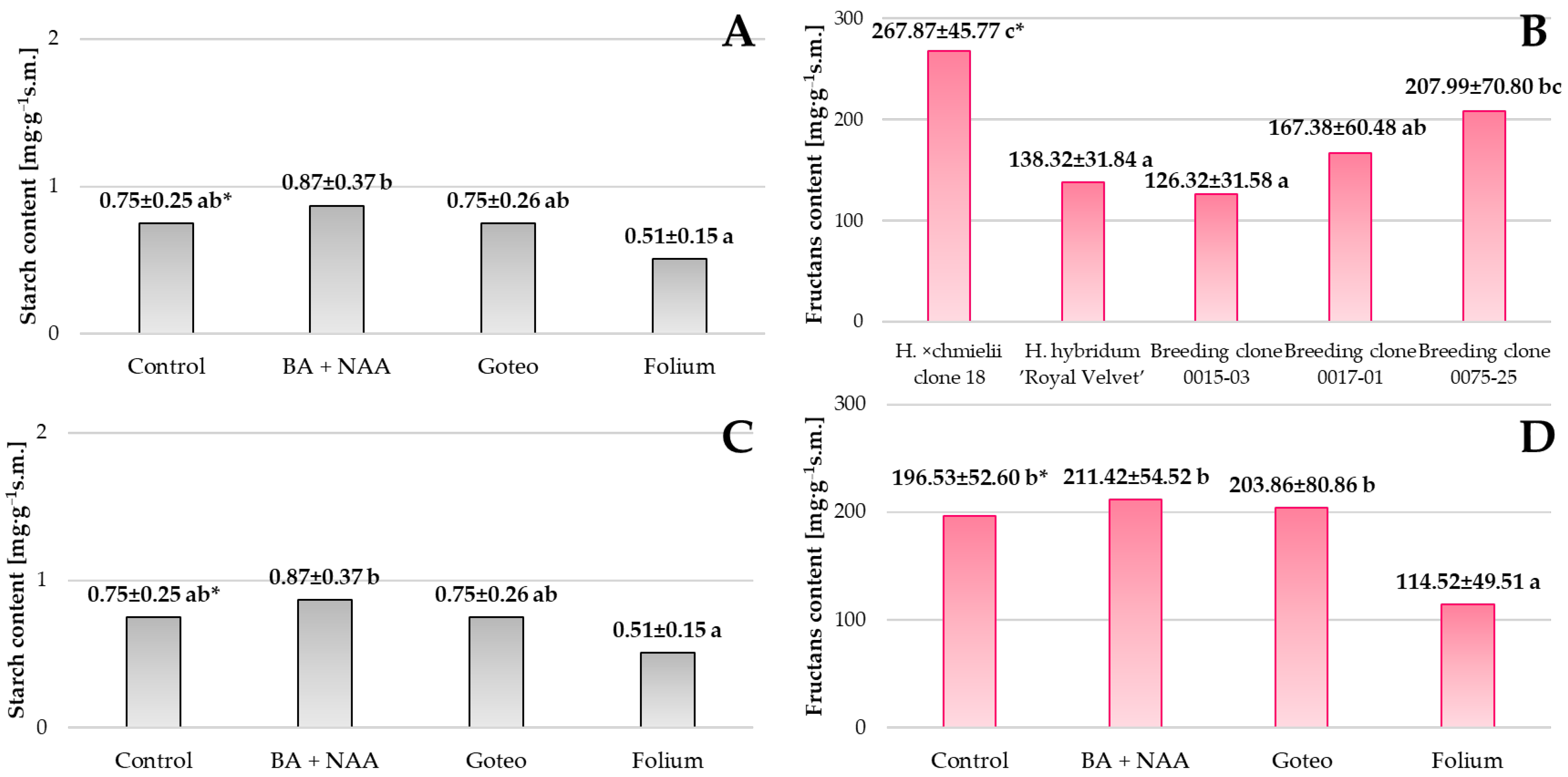 Analysis of the content of storage carbohydrates, including starch and fructans, in Hippeastrum bulbs showed differences between the genotypes studied and dependence on the biostimulants and growth regulators used. Starch, as an insoluble polysaccharide stored in plastids, and fructans, soluble sugars stored in vacuoles, play a key role in the ability of plants to adapt to environmental conditions and in the processes of growth and development, but also in subsequent flowering. The use of the Folium reduced the accumulation of reserve sugars, which may indicate a change in plant metabolism towards increased photosynthetic efficiency rather than storage of reserve substances. Further study of the effect of biostimulants and in-depth molecular analysis of their impact on the metabolism of reserve sugars in geophytes will contribute to the optimisation of plant growth and flowering.