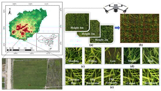 The experimental site and rice ear images. (a) Different image acquisition heights, (b) image cropping, (c) different growth stages, (d) different density, (e) date augmentation.