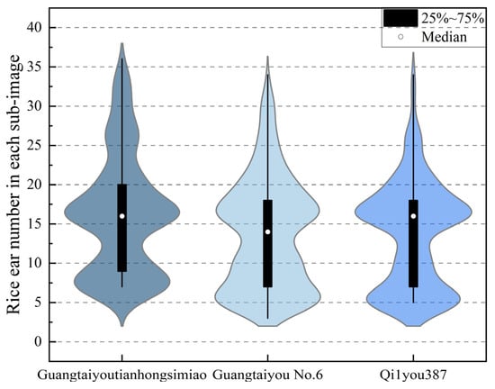 Field data processing involves image cropping and annotation. The central portion of UAV images is initially captured at a resolution of 4032 × 3024 pixels, owing to the distortion present at the edges. To enhance computational efficiency and expedite model training, each image is divided into 32 sub-images measuring 504 × 504 pixels (Figure 1b). After image cropping, the number of rice ears in each image ranges from 1 to 37. Specifically, 125 and 132 original images were collected at the heading stage and filling stage, respectively, for a total of 257 images. After image cropping, 2863 images were selected during the heading stage, and 1462 images were selected during the filling stage, for a total of 4325 images as the dataset, which was named UAVR. Figure 2 shows the violin plot of the rice ear number in each sub-image of three varieties. The images have been split into a training set, validation set, and test set in an 8:1:1 ratio.