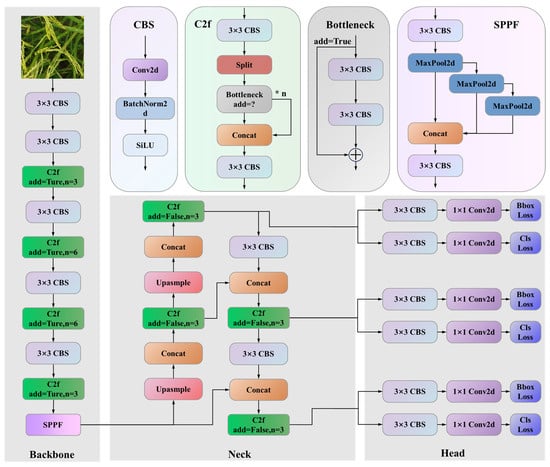 Detection of rice ear images necessitates rapid and precise identification. Therefore, we selected the YOLOv8 s model, which demonstrates balanced performance in accuracy and speed within the single-stage target detection algorithm, and made improvements on this model. The network structure, shown in Figure 3, consists of three primary modules: the backbone feature extraction network, the neck network, and the output head. The backbone mainly uses three modules, CBS, C2f, and SPPF (spatial pyramid pooling fast) [26], to extract features from the input image. The neck network uses a Feature Pyramid Network (FPN) [27] and Path Aggregation Network (PAN) [28] structure to fuse the features extracted from the backbone. The head network produces detection outcomes for targets of varying sizes utilizing three detection heads, informed by the loss function and the integrated image features.