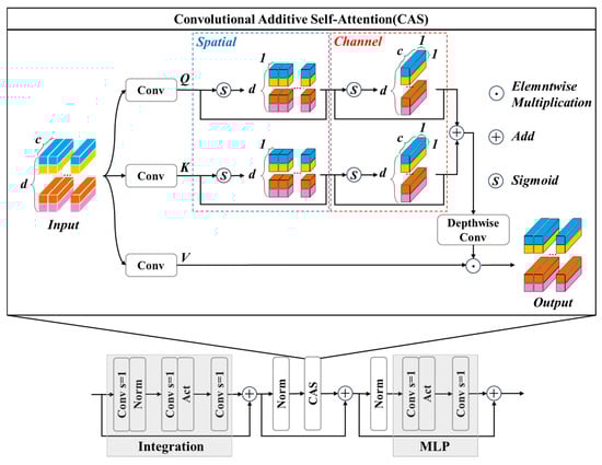 The self-attention mechanism effectively captures contextual information across various regions of the image by analyzing the global information of all pixels present. The mechanism can adaptively modify attention weights, enhancing recognition capabilities for complex images. It can dynamically adjust the attention weight based on input image characteristics and enhance recognition ability for complex images. However, this adaptability also leads to increased complexity and global information imbalance within the self-attention mechanism. We introduce the Additive Block in CAS-ViT [30], which includes three parts with residual shortcuts: Integration, Convolutional Additive Self-attention (CAS), and Multilayer Perceptron (MLP). The structure is shown in Figure 4. Among them, CAS uses convolution as a linear transformation to capture the global contextual relationships in the spatial and channel dimensions of Query and Key, enhancing the model’s ability to capture long-range image dependencies while reducing complexity.