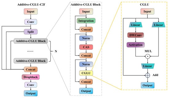 In addition, CGLU is integrated into Additive Block. CGLU functions as a channel mixer by incorporating a 3 × 3 deep convolution behind the activation function of GLU gated branch. This modification transforms it into a gated channel attention mechanism that uses nearest neighbor features, thereby enhancing both the computational speed and robustness of the model. In summary, we integrate the Additive Block and CGLU concepts into the C2f module, replacing the bottleneck with the Additive-CGLU Block, and incorporate Dropblock following the Concat layer to reduce overfitting. The AC-C2f module has been formed, and its structure is shown in Figure 5.