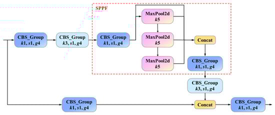 The SPPF module in YOLOv8 s conducts pooling operations on feature maps from various dimensions to enhance the receptive field. The fixed size (5 × 5) of the maximum pooling operation in SPPF limits the model’s adaptability to targets of different scales. This method fails to sufficiently capture the complex and diverse spatial characteristics of rice ear targets. UAVs are significantly influenced by various factors, including weather conditions, light intensity, and leaf occlusion during rice ear detection tasks. Consequently, the SPPFCSPC_G module replaces the original SPPF module in the YOLOv8 s model, as shown in Figure 6. The module uses group convolution as replacement for the ordinary convolution. It divides the input channels into multiple independent groups and conducts convolution operations on each group individually, which decreases the module parameters while maintaining the representational capacity of the network. This module separates the features extracted from Backbone into two branches. One branch uses multiple group convolutions to conduct fine-grained processing on the features, then improves feature extraction abilities by the SPPF module to capture multi-scale information within the image. The other branch uses the cross-stage partial connection (CSPC) optimization strategy. Original feature information is better preserved through 1 × 1 group convolution, and feature reusability is enhanced [31]. Finally, the two branches are spliced and fused, with the addition of a convolution module to integrate the deep and shallow features effectively, thereby enhancing the model’s capacity to comprehend complex scenes.