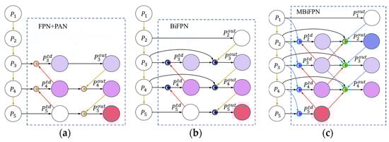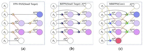 Different multi-scale feature fusion networks. (a) The structure of FPN + PAN (small target ver), (b) the structure of BiFPN (small target ver), (c) the structure of MBiFPN with Conv.
