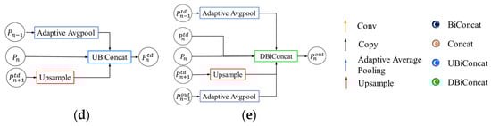 Comparison of different feature fusion network structures. (a) The structure of FPN + PAN, (b) the structure of BiFPN, (c) the structure of MBiFPN, (d) the structure of the UBiConcat module, (e) The structure of the DBiConcat module.