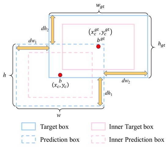 where: xc gt and yc gt respectively represent the center point coordinates of the target box and inner target box, while xc and yc respectively represent the center point coordinates of the predicted box and inner predicted box.