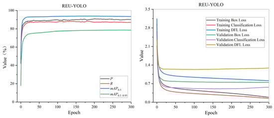 Figure 9 presents the training results for the REU-YOLO model. The P of REU-YOLO is 90.76%, the R is 86.94%, the mAP at IoU 0.5 (mAP0.5) is 93.51%, and the mAP at IoU 0.5:0.95 (mAP0.5:0.95) is 78.45%. Analysis of the training curve indicates that model performance stabilizes after 300 epochs of training. Throughout the training cycle, the model’s loss value consistently declines, while P and R increase concurrently, meaning a progressive enhancement towards optimal performance during the continual optimization process.