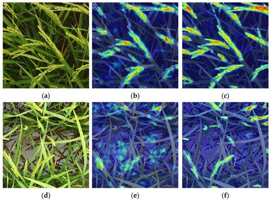 Gradient Weighted Class Activation Mapping (Grad CAM) heatmaps are employed to compare and analyze the feature extraction capabilities of the YOLOv8 s and REU-YOLO models, as illustrated in Figure 11. Red and yellow signify areas of high importance, whereas blue and green denote areas of low importance. The heatmap indicates that regions of higher importance significantly influence detection performance. From the figure, it can be seen that the YOLOv8 s model specifically focuses on certain features of rice ears. A high distribution density of rice ears increases the risk of missed and false detections. In addition, the detection of exposed rice ear images with a water background shows that the heat source is not fully concentrated on the rice ears, which indicates that the background environment disrupts the YOLOv8 s model’s performance. The figure demonstrates that the REU-YOLO model indicates a more concentrated attention area, accurately focusing on the heat source associated with the rice ear target. This demonstrates that the improved REU-YOLO possesses superior feature extraction capabilities for rice ears.