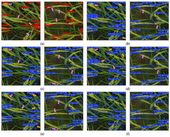 Factors including various densities, lighting conditions, and backgrounds can influence the effectiveness of rice ear detection. As rice progresses to the filling stage post-heading, the volume proportion of rice ears will increase. Higher planting density leads to more severe obstruction between ears and between leaves and ears. Variations in lighting conditions during data collection can lead to huge differences in the images. Increased lighting intensity correlates with a higher risk of rice ears turning yellow, potentially resulting in blurred details. In low light conditions, rice ears exhibit a greenish hue, and their texture becomes more distinct. The image of the rice ear is sourced from the field, featuring a background that comprises branches, leaves, soil, water, and reflections, thereby illustrating a complex distribution. Figure 16 presents the detection results for the REU-YOLO model across various densities and lighting conditions. Figure 16a illustrates that REU-YOLO maintains effective detection performance with occlusion, dense distribution, and spikelets under exposure. As density increases, the rice ears in the image center are influenced by the low-altitude airflow of the UAV, leading to aggregation. This complicates the phenomena of intertwining, occlusion, and adhesion among the ears and between the ears and leaves, making the detection task more difficult. Consequently, REU-YOLO has encountered several missed detections (indicated by the pink arrow) and false detections (indicated by the orange arrow). Figure 16b illustrates that the distortion at the edge of the UAV image results in the elongation of rice ears, hence increasing their adherence and occlusion. In high-density distribution, certain attached rice ears may be detected collectively, leading to incomplete detections. Nonetheless, REU-YOLO successfully detected the majority of rice ears, demonstrating the model’s efficacy in diverse and complex field environments. Future study will concentrate on enhancing the dataset by employing higher-resolution cameras to capture data from elevated angles, thus preventing the aggregation and blurring of rice ears produced by low-altitude airflow and reducing image edge distortion.