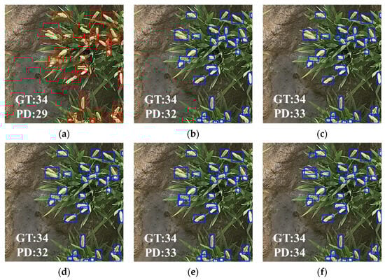 Detection results obtained by different models on the DRPD dataset. (a) SSD, (b) YOLOv5 s, (c) YOLOv8 s, (d) YOLOv9 s, (e) YOLOv10 s, (f) REU-YOLO. Note: GT denotes the ground-truth count, and PD the predicted count.