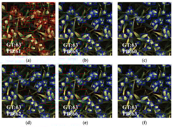 Detection results obtained by different models on the GWHD dataset. (a) SSD, (b) YOLOv5 s, (c) YOLOv8 s, (d) YOLOv9 s, (e) YOLOv10 s, (f) REU-YOLO. Note: GT denotes the ground-truth count, and PD the predicted count.