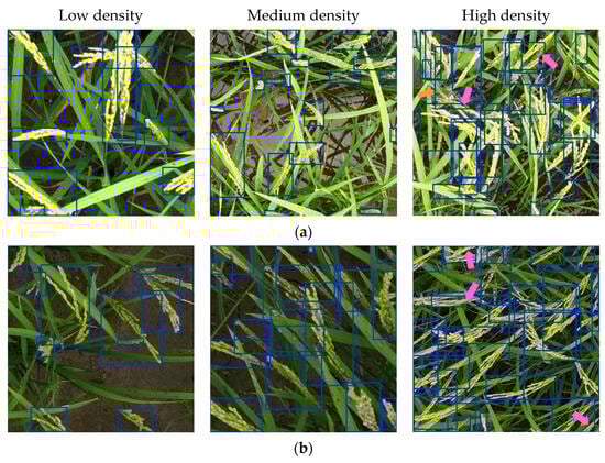 Detection results for rice panicles under different densities and light conditions. (a) Detection results for rice panicles under high brightness lighting conditions, (b) detection results for rice panicles under low brightness lighting conditions.