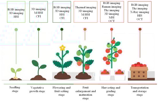 This section provides an overview of the application scenarios of nine technologies in six stages, from seedlings to transportation and storage. Different sensors are applied to different growth cycles, as shown in Figure 1.