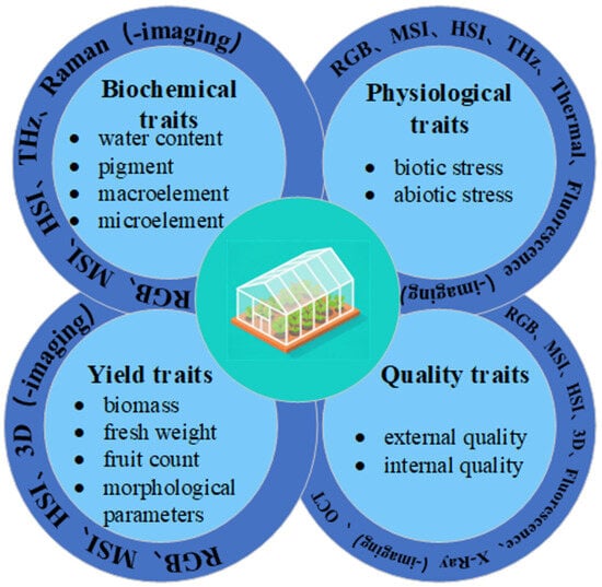We categorize the phenotypic traits of protected-culture vegetables into biochemical traits, physiological traits, yield traits, and quality traits, covering key indicators from basal metabolism throughout the entire growth cycle to final economic value. Simultaneously, we clarify the application directions of technologies such as RGB, multi-/hyperspectral imaging, and thermal imaging in detecting biochemical traits, physiological traits, yield traits, and quality traits, as shown in Figure 2.
