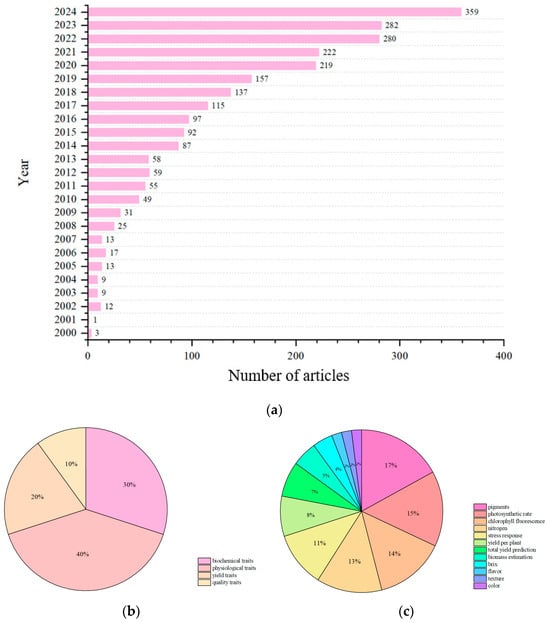 Statistics on the application of optical sensing technology in phenotyping studies of facility vegetables from 2000 to 2024: (a) number of relevant articles published per year since 2000; (b) percentage of studies on four phenotypic traits; and (c) percentage of studies on common traits in phenotypic studies on facility vegetables.