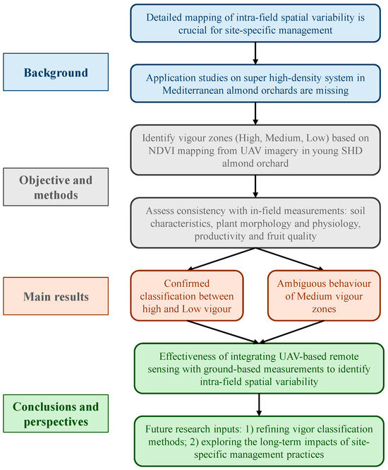 The study site was selected because (i) it exemplifies the rapidly expanding SHD production model across the Mediterranean basin, (ii) its young age (planted in 2018) offers a rare opportunity to capture the early development of spatial heterogeneity, and (iii) it is managed commercially using standard practices, ensuring that findings are directly transferable to growers. In each vigor zone field, measurements included physiological and morphological assessments, almond yield and quality evaluations, as well as physical and chemical soil analyses. This study aimed to determine whether and how the observed intra-field variability should inform adjustments to current agricultural practices, highlighting the implications for almond growers in terms of targeted management and optimized resource allocation. Figure 1 synthesizes the aims and process steps of the present study.