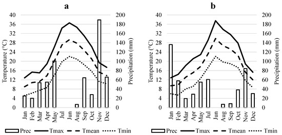 Meteorological conditions of 2022 (a) and 2023 (b). Maximum temperature (Tmax), minimum temperature (Tmin), mean temperature (Tmean), and Precipitation (Prec) data were provided by the Environmental Protection Agency of Sardinia (ARPAS).