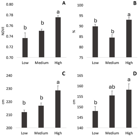 Bar charts of trees’ structural parameters: NDVI (A), Photosynthetically Available Radiation (PAR) attenuation (B), Height (C), and Depth (D). Error bars represent standard error. Different lowercase letters indicate significant differences between vigor categories, according to Tukey’s HSD test (α < 0.05).