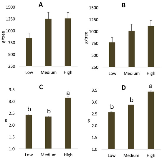 Bar charts of fruit production of 2022 (A) and 2023 (B) growing seasons, and hulled fruit weights of 2022 and 2023 ((C) and (D), respectively) according to vigor class. Different lowercase letters indicate significant differences between vigor categories, according to Tukey’s HSD test (α < 0.05).