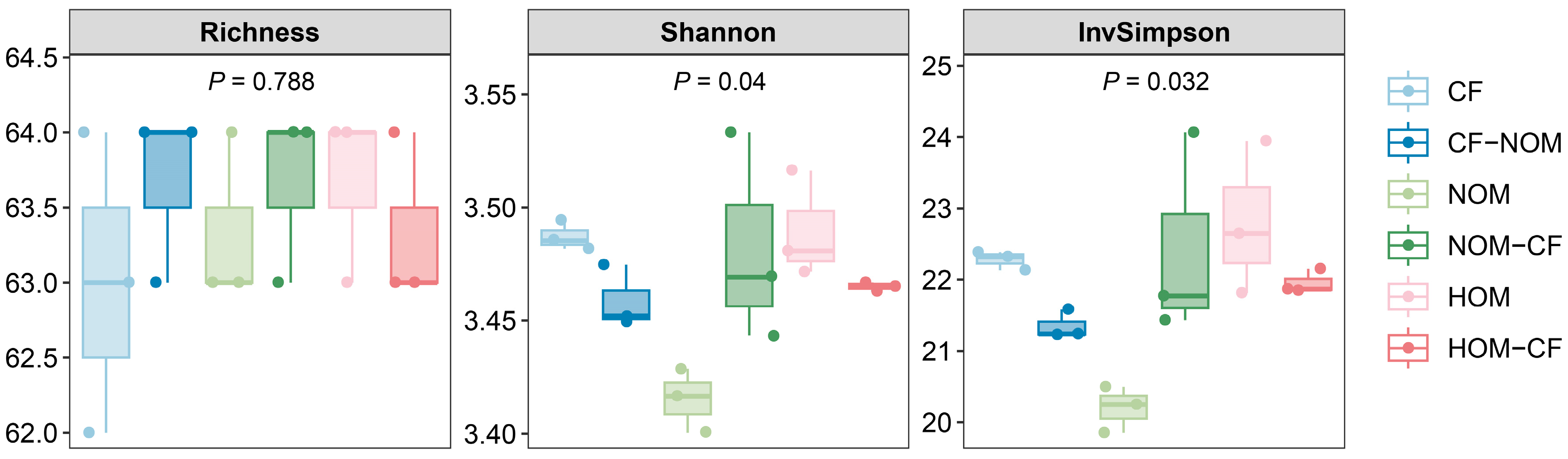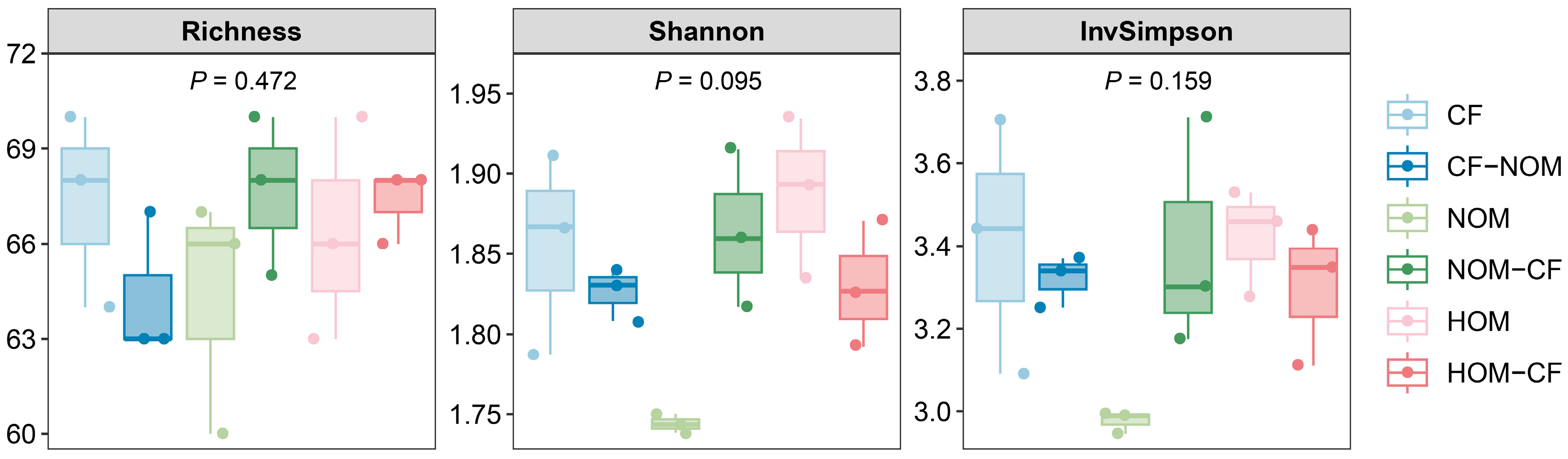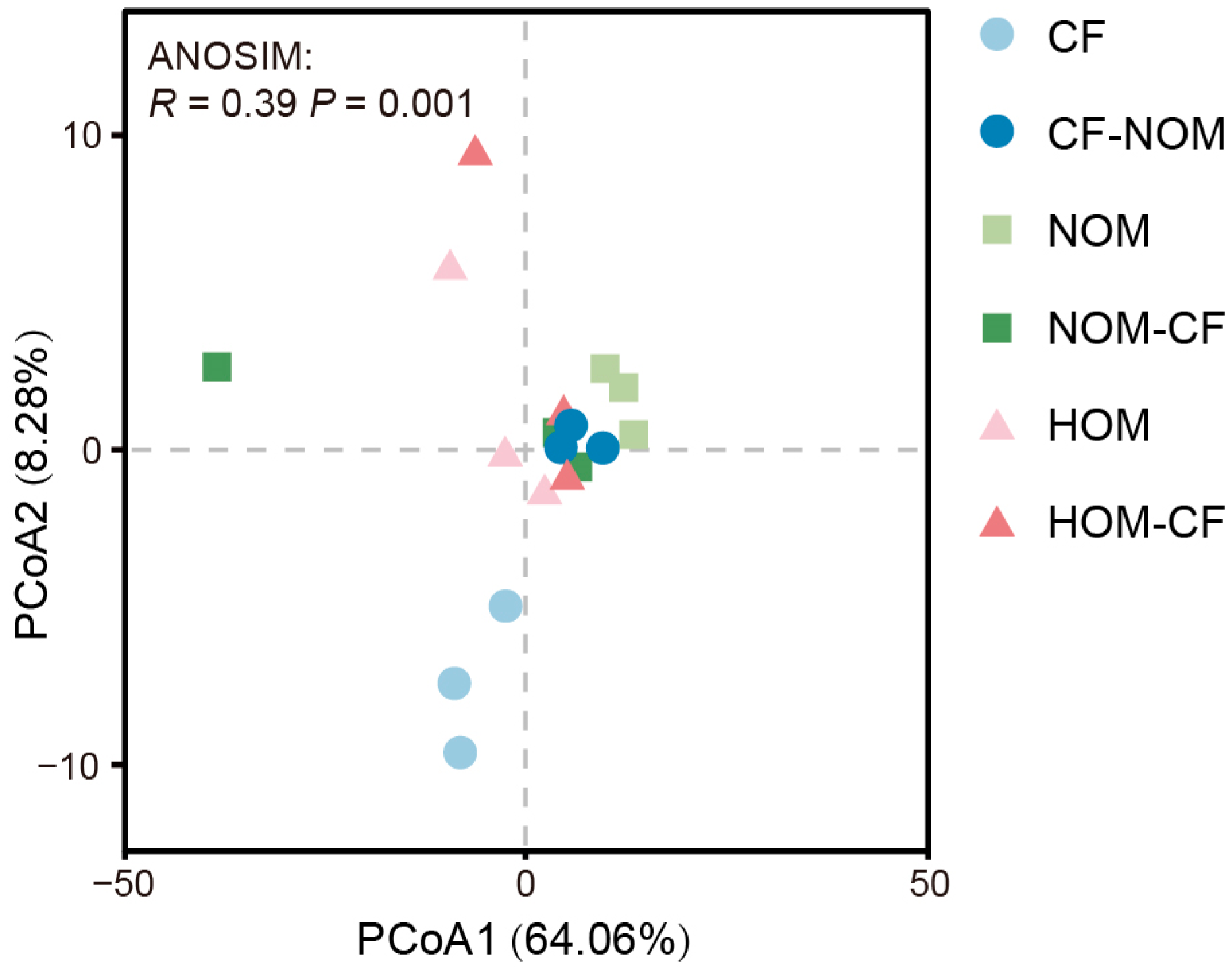 | CF-NOM | 5.13 ± 0.05 a | 0.96 ± 0.03 b | 15.47 ± 0.61 a | 1.78 ± 0.07 a | 14.70 ± 2.81 a | 0.79 ± 0.26 a | 18.23 ± 3.46 b | 242.67 ± 23.02 a |