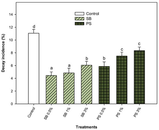 Incidence of fungal decay (%) in Fino lemons from the 2021–2022 growing season, treated in preharvest with sodium benzoate (SB) and potassium sorbate (PS) at 0.5, 1 and 3% after 35 days of storage at 8 °C. Values are means ± standard error. Significant differences (p < 0.05) between treatments are indicated by different letters according to the Tukey test.