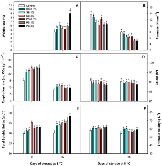 Effect of sodium benzoate (SB) and potassium sorbate (PS) at three concentrations (0.1, 1, 3%) on the weight loss (A), firmness (B), respiration rate (C), colour (D), total soluble solids (E) and titratable acidity (F) of Fino lemons at harvest and after 35 days of storage at 8 °C during the season 2021–2022. Values are means ± standard error. Significant (p < 0.05) differences between treatments are indicated by different letters according to the Tukey test.