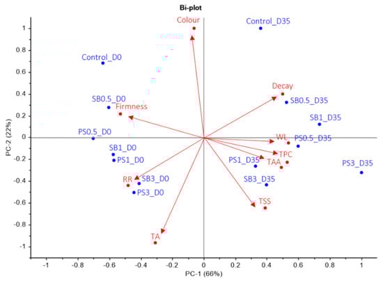 A principal component analysis (PCA) was performed on all the results, revealing that PC-1 and PC-2 explained 66% and 22% of the total variance in the X and Y variables, respectively (Figure 4). The cumulative variance contribution of PC-1 and PC-2 was 88%. PC-1 was clearly associated with WL (0.40), firmness (−0.39), RR (−0.35), decay (0.37), TPC (0.36) and TAA (0.36), while PC-2 was related to colour (0.58), TSS (−0.38) and TA (−0.58). Parameters on the negative side of PC-1 were colour, firmness, RR and TA, while on the positive side were found decay, TSS, TAA, TPC and WL. The most important parameters on the negative side of PC-2 were RR, TA, TSS, TAA, TPC and WL, and on the positive side were found firmness, colour and decay. The results showed that PC-1 allowed differentiation of postharvest storage into two groups: lemons analysed on day 0 were located on the negative side, while those analysed after 35 days of cold storage were located on the positive side. For PC-2, the results could be divided into three groups: the first group consisted of both controls; the second group included lemons treated with 0.5% and 1% SB and PS at harvest and after 35 days of cold storage; and the third group was mainly represented by lemons that were treated with 3% SB and PS.