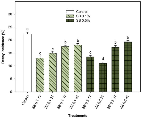 The incidence of decay was evaluated after 35 days of storage at 8 °C (Figure 5). All treatments resulted in a significantly (p < 0.05) lower fungal decay, regardless of the concentration and number of applications. However, it was observed that a lower number of applications, once (1T) or twice (2T), resulted in a greater reduction in decay incidence than in non-treated lemons. A single application of SB at 0.1% and 0.5% resulted in reductions of decay incidence of 41.70% and 39.46%, respectively, while two applications of SB at 0.1% and 0.5% resulted in reductions of 33.18% and 50.67%, respectively.