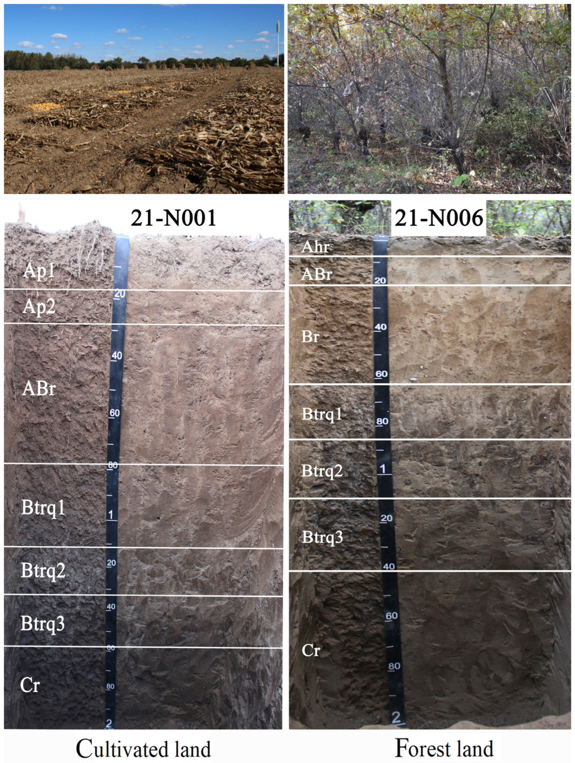 - Hao, X.X.; Han, X.Z.; Li, L.J.; Zou, W.X.; Lu, X.C.; Qiao, Y.F. The influence of land use patterns on the distribution and carbon storage of organic matter in the black soil profile. Chin. J. Appl. Ecol. 2015, 26, 965. [Google Scholar]