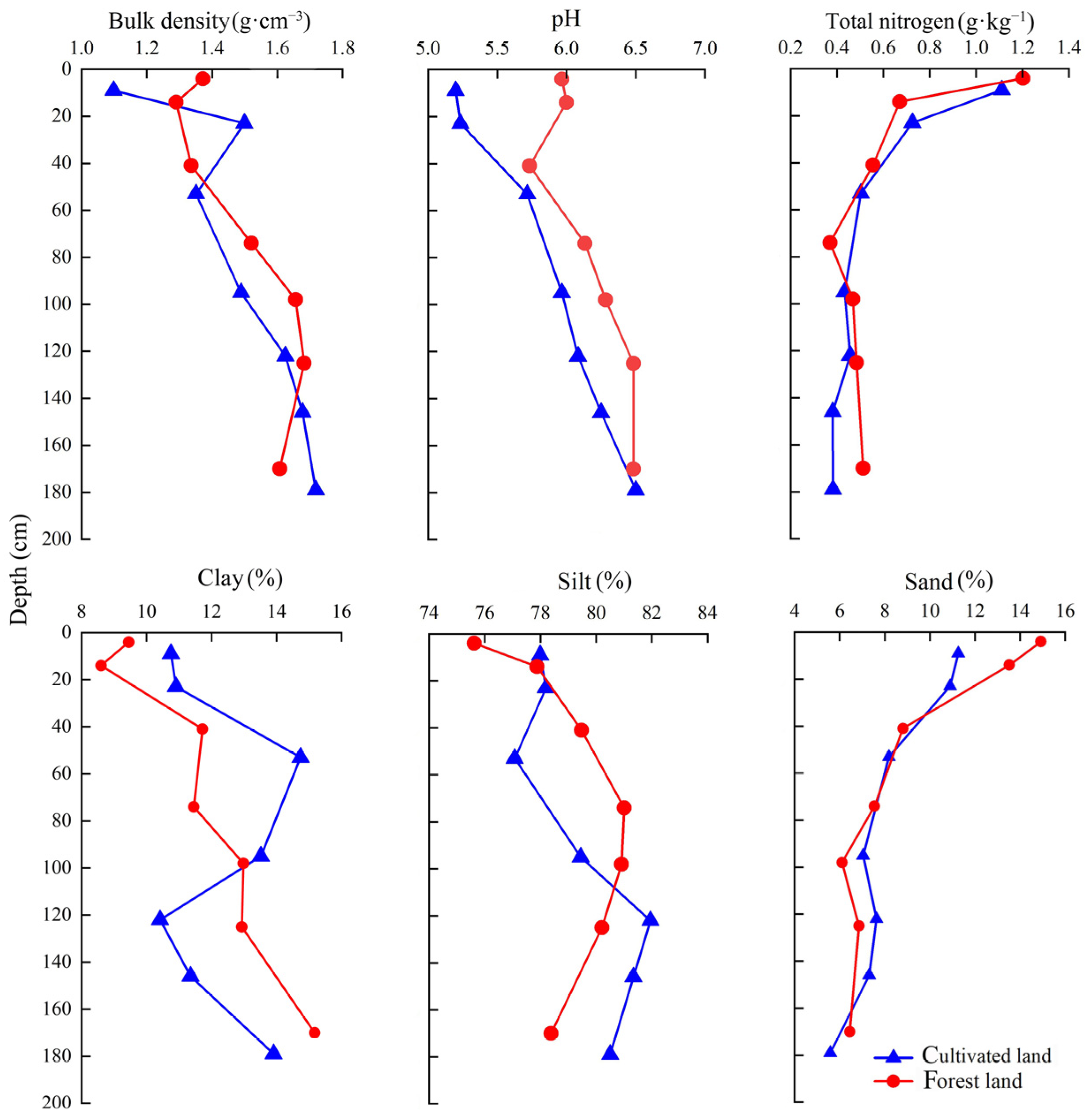 | Land Utilization Type | Bulk Density | pH | Total Nitrogen | Clay | Silt | Sand |