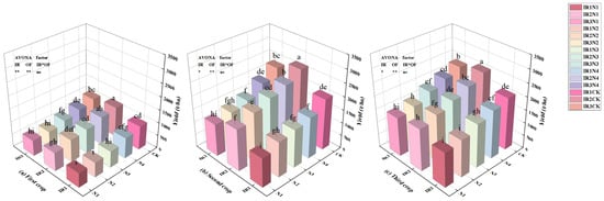 Effect of different water depths and EM (effective microorganism) organic fertilizer application on alfalfa yield ((a–c) are alfalfa yields of the first, second, and third crops, respectively. IR1, IR2, and IR3 represent the water depths of 8 mm, 16 mm, and 24 mm, respectively. CK, OF1, OF2, OF3, and OF4 represent EM organic fertilizer application rates of 0 kg/ha, 1500 kg/ha, 3000 kg/ha, 4500 kg/ha, and 6000 kg/ha, respectively. The data in the graphs are means ± standard deviation. Different letters (a, b, c, etc.) above the numerical columns indicate significant differences at 0.05 level, according to Duncan’s multiple range test. *, **, ns represent significant (0.05), very significant (0.01), and non-significant.