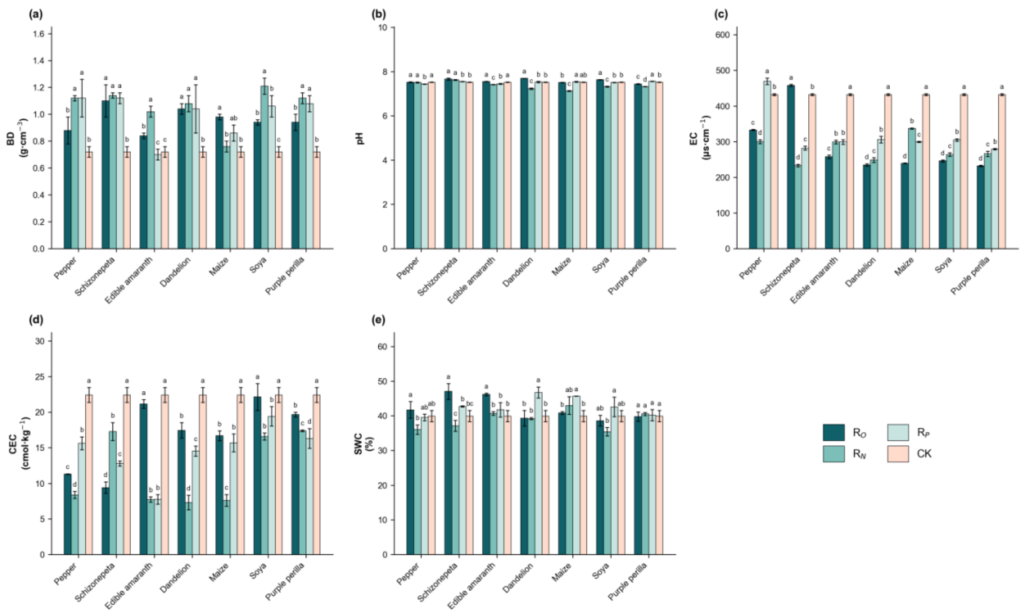 | Group | Soil pH | Electrical Conductivity μs·cm−1 | Cation Exchange Capacity /cmol·kg−1 | Soil Water Content /% | Soil Bulk Density /g·cm−3 |