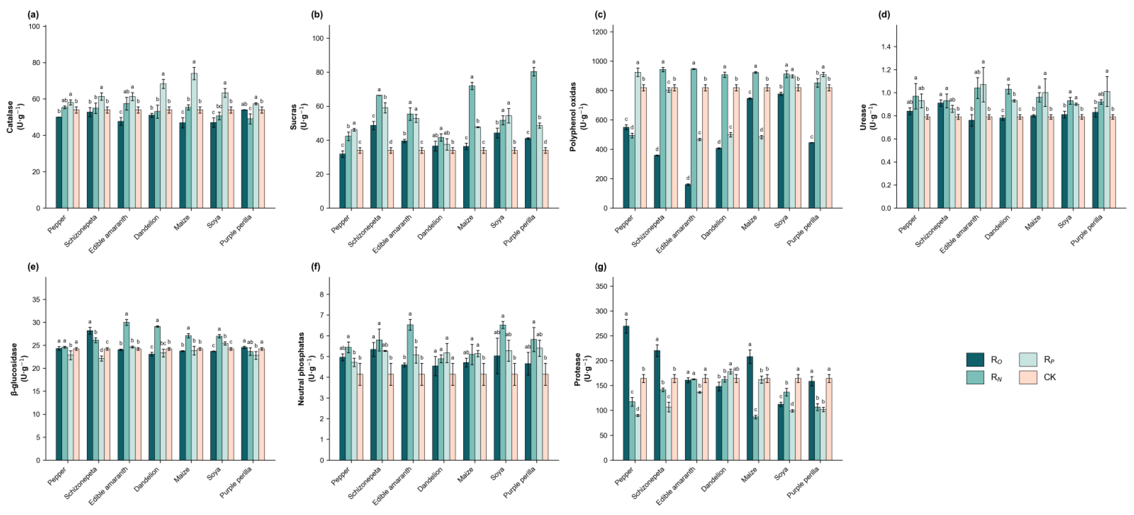 | Group | Catalase /U·g−1 | Sucrase /U·g−1 | Polyphenol Oxidase /U·g−1 | Urease /U·g−1 | β-Glucosidase /U·g−1 | Neutral Phosphatase /U·g−1 | Protease /U·g−1 |