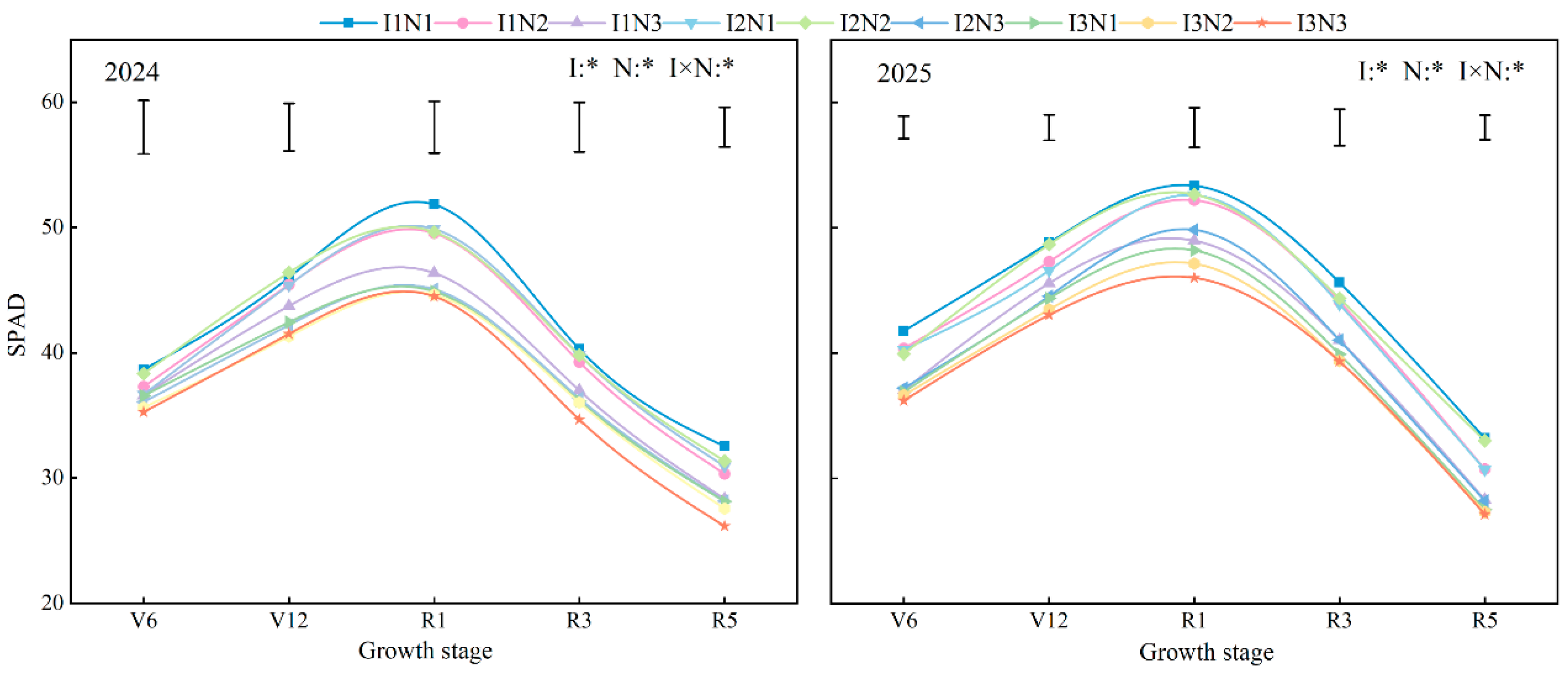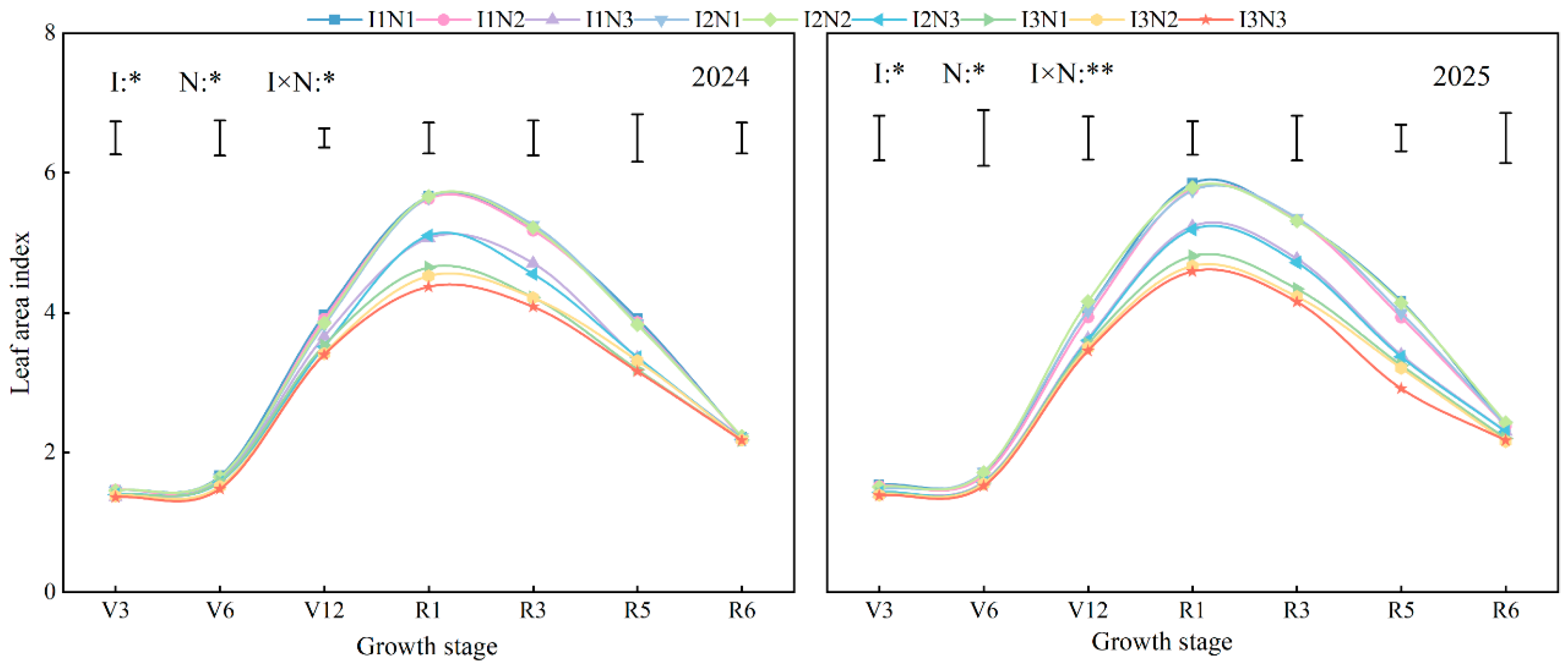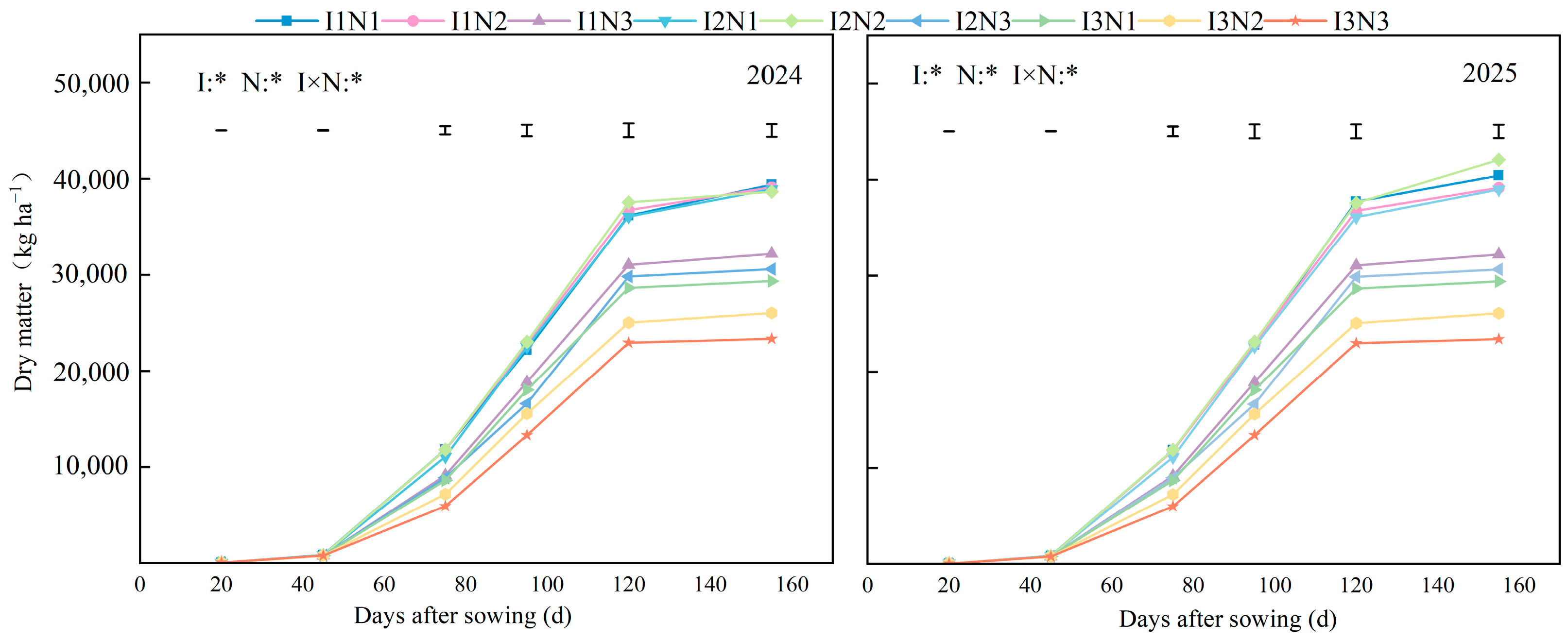 | 2025 | I1N1 | Y = 41711.9/(1 + 6.237e−0.069t) | 0.993 | 717.3 a | 90.7 ab | 270.4 a |