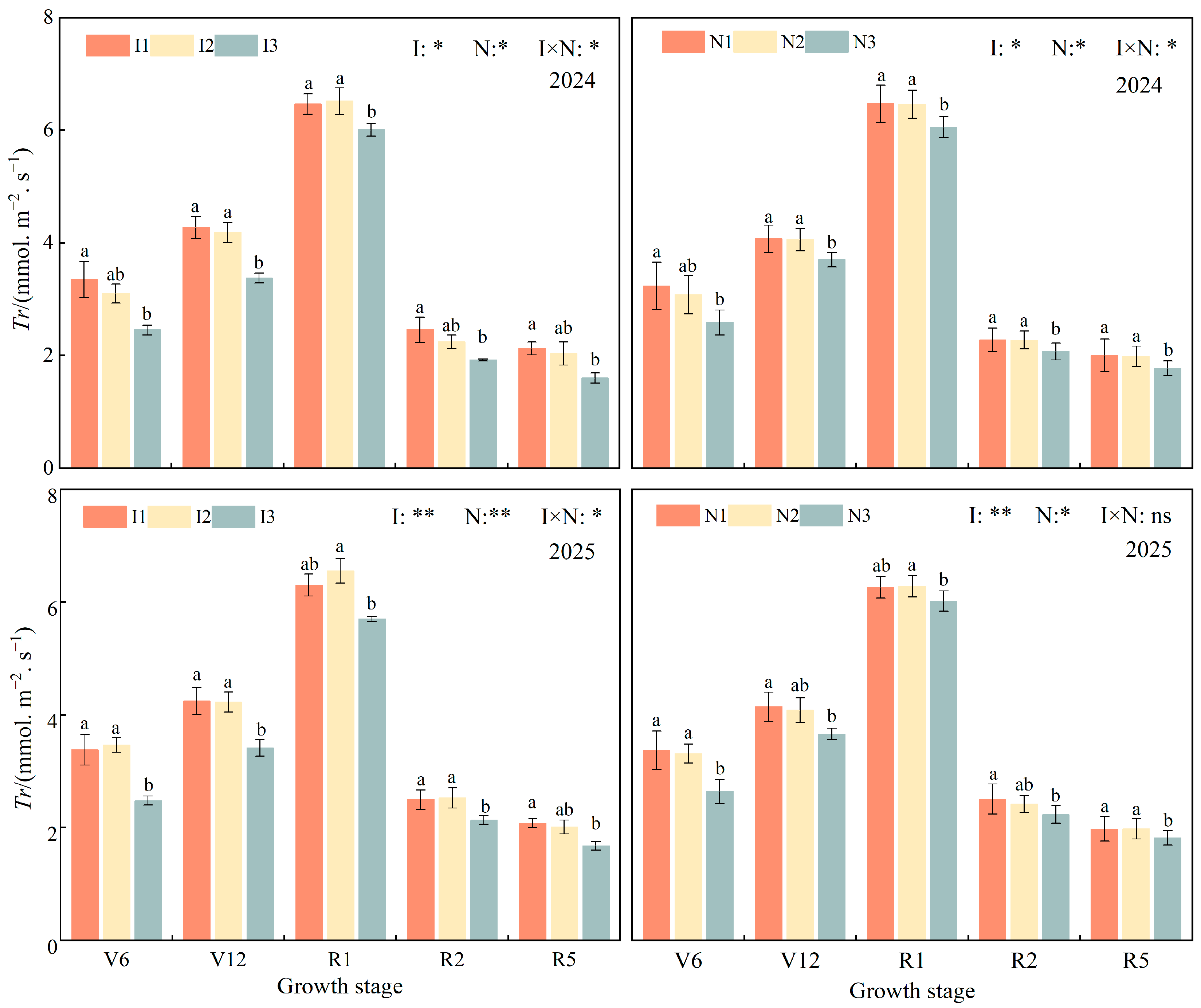 | Irrigation level (I) | ** | * | ** | ** |