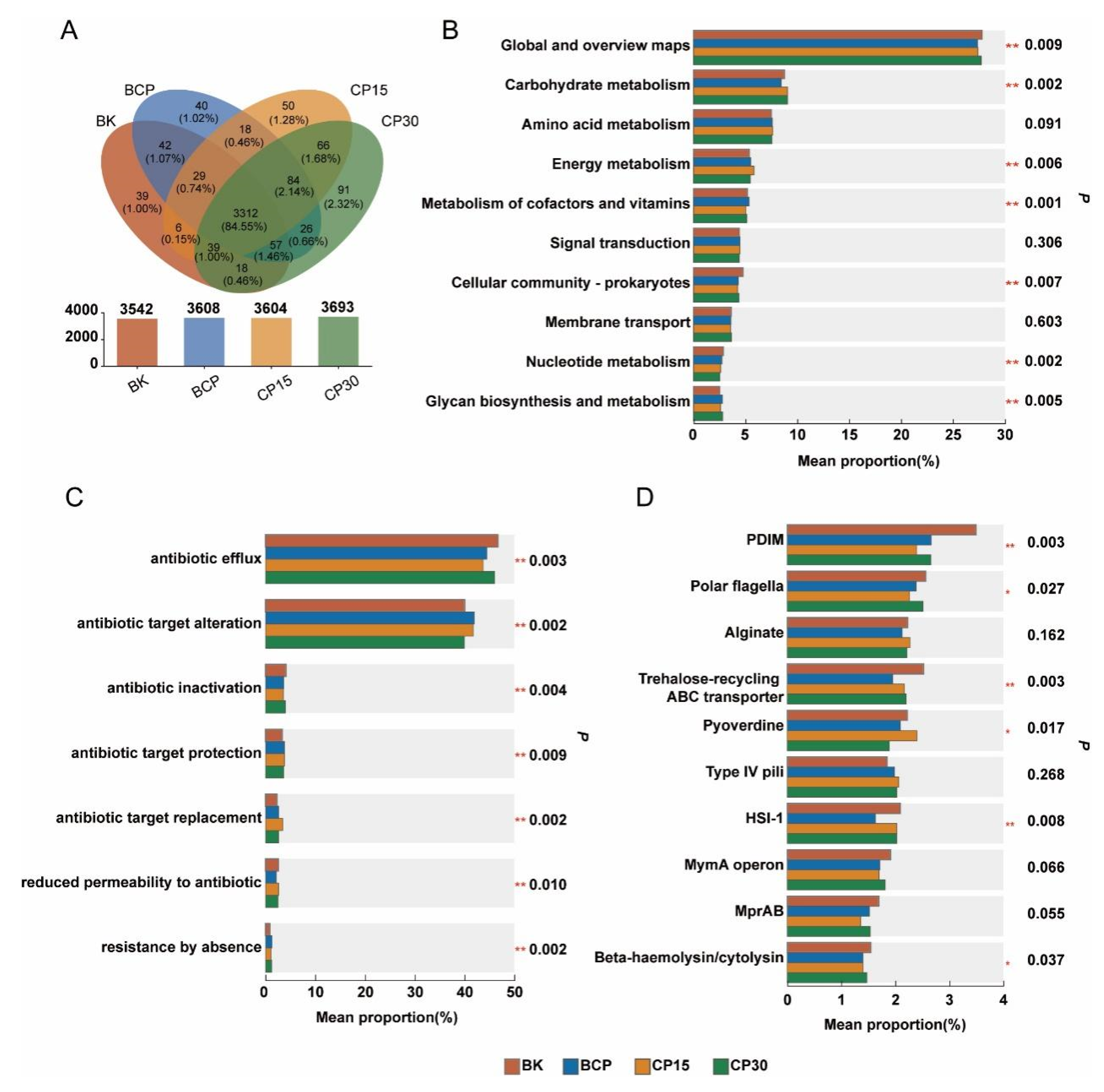3.4. Effect of Forest Soil Amendment on the Composition of Microbial Functional Pathways, Antibiotic Resistance Genes, and Virulence Factors