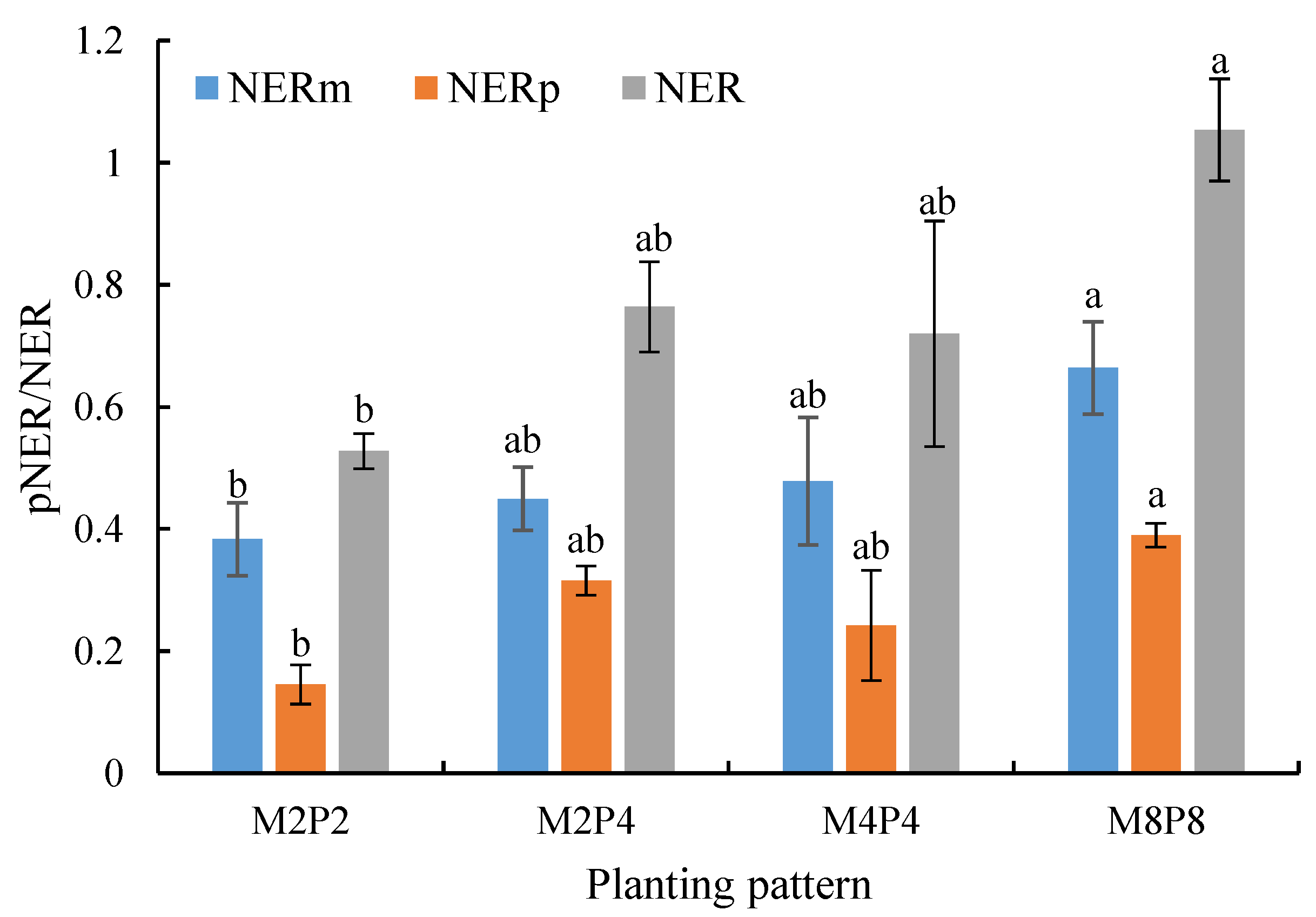 | M8P8 | 0.62 ± 0.09 ab | 0.34 ± 0.10 a | 0.95 ± 0.14 a | |