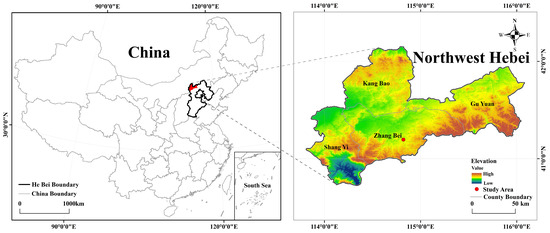 The experiment was conducted in 2023–2025 at the Zhangbei Key Field Observation Experiment Station of Agricultural Resources and Ecological Environment of the Ministry of Agriculture and Rural Affairs (114°42′ E, 41°09′ N) on the Bashang Plateau of Hebei Province, China, which had an alpine semi-arid continental monsoon climate zone typical of north China. The test area was at an altitude of 1420 m a.s.l. The average annual rainfall was 382.5 mm, the growing season (1 May to 30 September) received approximately 300 mm of precipitation, and the coefficient of variation in interannual rainfall was 28%; the potential evapotranspiration was 804.1 mm. The regional average annual temperature was 3.9 °C, with a frost-free period of 130 d and ≥10 °C cumulative temperature of 2426.3 °C·d, and the annual average number of hours of sunshine was 2900 h [22]. The regional inter-seasonal dry and wet differences were obvious; rain and heat were synchronized with crop fertility, and low temperature and drought were the main limiting factors for crop production. During the study period, the precipitation in the 2023 crop growing season (1 May to 30 September) was 201.7 mm, characterizing a relatively dry year; while the figures for 2024 and 2025 were 525.3 mm and 666.0 mm respectively, which were both classified as extremely wet years. The location of the study area is shown in Figure 1.
