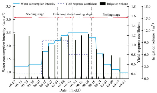 In this study, the yield response coefficients (Ky, Figure 3) recommended by the FAO for different fertility stages of tomato [23] were used to evaluate the extent of the effect of drought stress on tomato yield in each period, which represents the proportion of yield reduction per unit reduction in water demand relative to maximum (non-stressed) conditions.