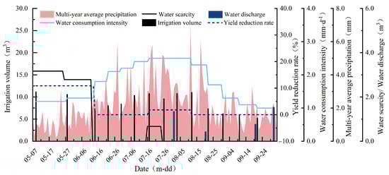 The water supply and production effects of greenhouse tomato fields irrigated with rainwater harvested from greenhouse film under the scenario of multi-year rainfall average values are summarized in Figure 4. The harvested rainfall during the growth period was 126.3 m3; including the rainfall harvested 30 days before transplantation, a total of 134.4 m3 of rainwater could be harvested. Considering the water discharge of 4.1 m3 during the growth period, the water supply satisfaction rate of tomato during the whole growth period reached 106.3%. As a consequence of the size of the rainwater tank (14.4 m3) and the wide variation in rainfall occurrences, there were still three tomato irrigation periods with different degrees of water scarcity. As the harvested rainfall 30 days before transplantation was only 8.0 m3, the water scarcity was 3.2 m3 and 2.8 m3, respectively, from 9 May to 24 and from 25 May to 4 June in the early tomato growth period, requiring supplemental irrigation with groundwater. Later, with the arrival of the rainy season and consequently more frequent rainfall water supply for rain storage, the tomato field water demand satisfaction rate reached 100%, and there was surplus water obtained. From 17 July to 25 July, the water scarcity was 0.7 m3 owing to the decrease in rainfall. Later, with the decreased water consumption intensity of tomato fields, irrigation with harvested rainwater alone met the water demand of tomato in its later stage.